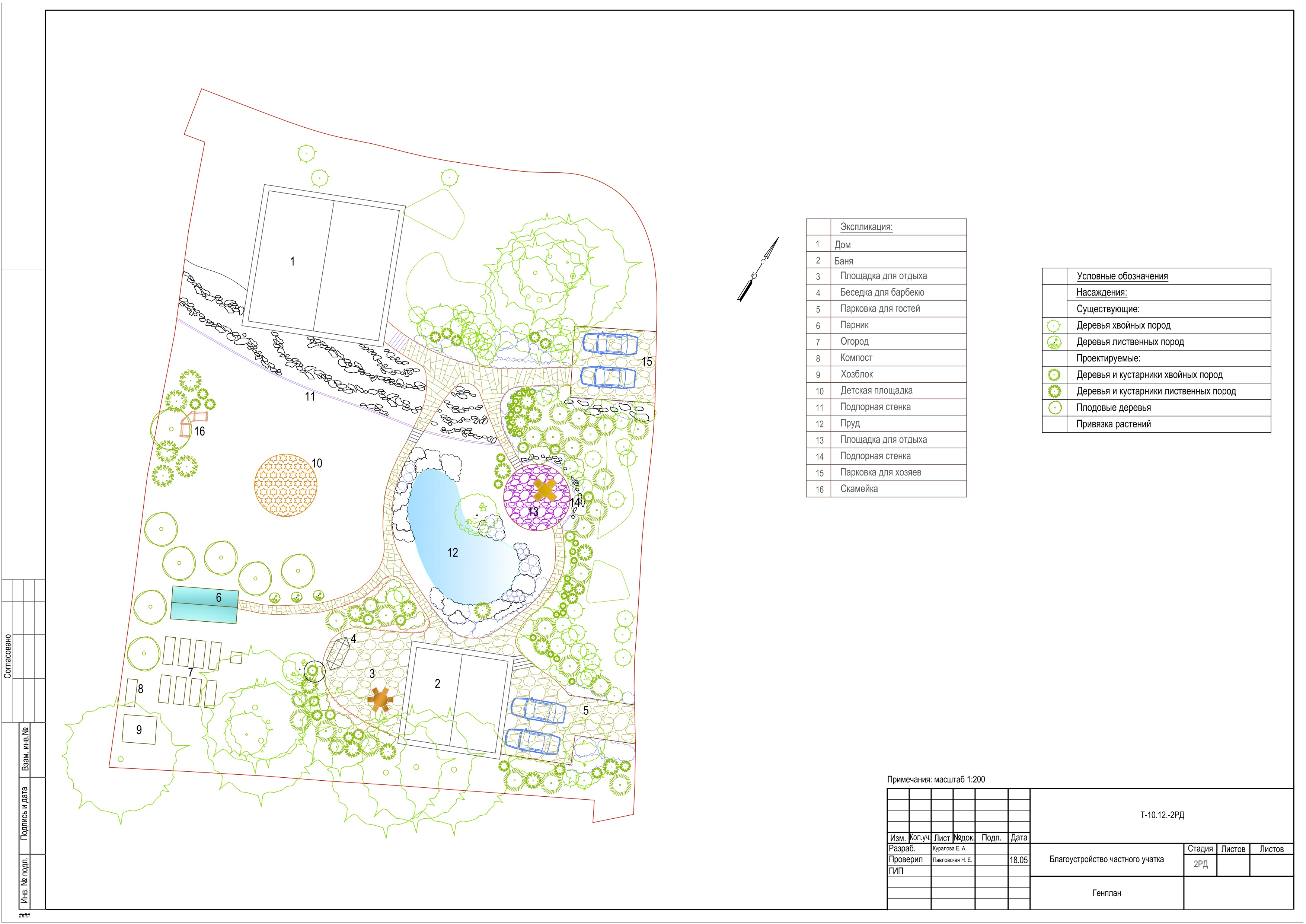 Составляется на основании эскиза генплана - разработка общей концепции озеленения и благоустройства участка. Изначально мы разрабатываем 2 варианта, согласуем и только после переходим к рабочему проекту.